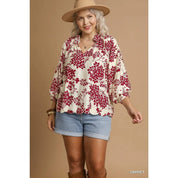 Cherry Blossom Print Scalloped Hem Blouse - V-neckline - 3/4 balloon sleeves - Relaxed, flowy fit - Scalloped hemline - Not Lined - 83% Rayon 17% Nylon