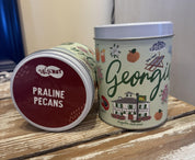 Celebrate Southern sweetness and Georgia pride with this decorative tin of Praline Pecans! Beautifully designed with a State of Georgia theme, this collectible tin showcases iconic imagery that pays tribute to the Peach State—making it a perfect keepsake or gift.