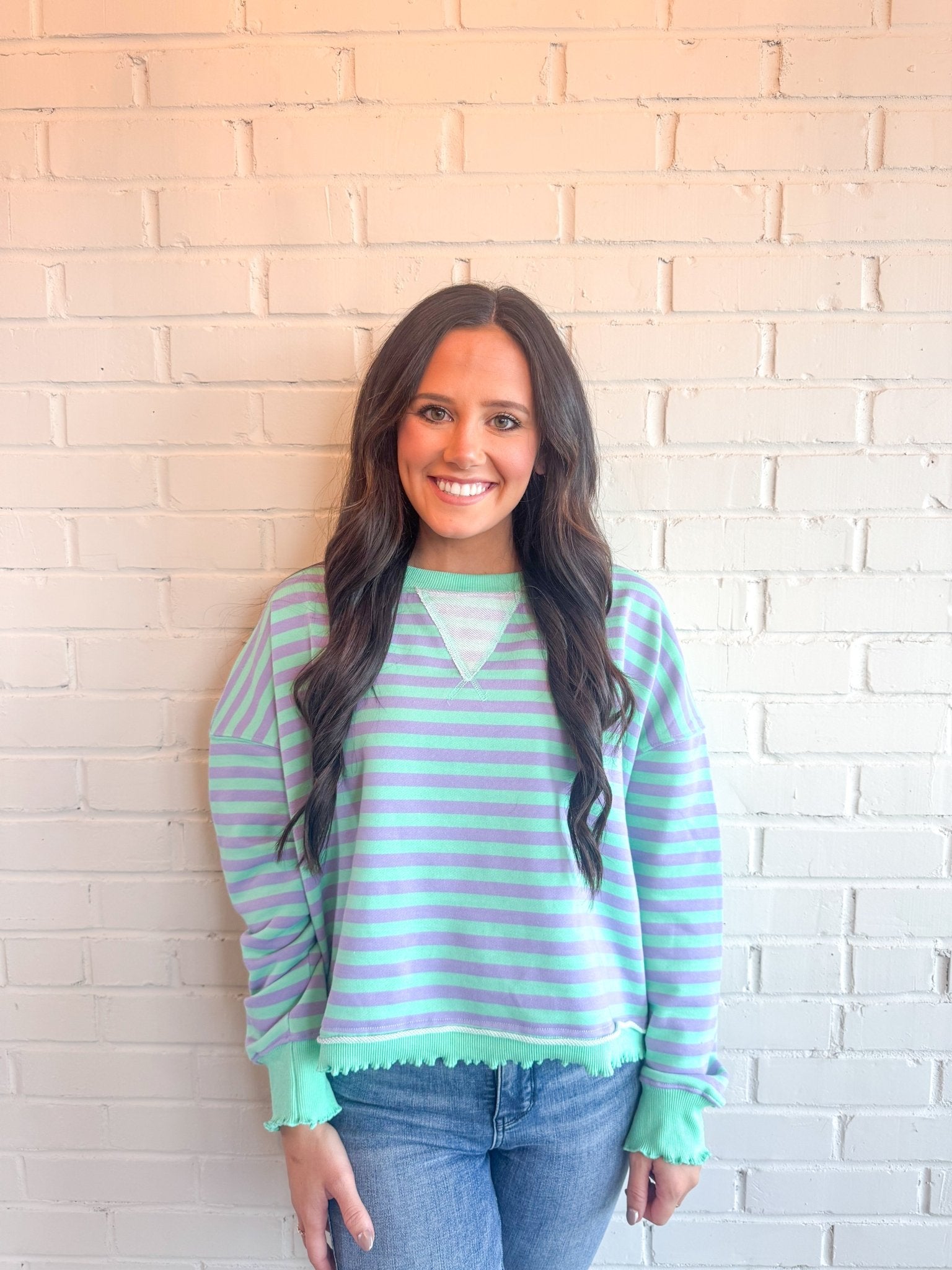 This cropped, mint and lavender striped, terry top will look great with a pair of jeans or athleisure pants.