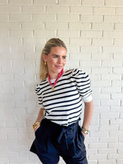 This sweater features a crisp white base with bold, contrasting stripes in your choice of black or red—perfect for showing your team spirit in style. The classic stripes add a dynamic touch, while the band at the bottom and soft, banded short sleeves provide a polished, structured fit. Whether you're cheering from the stands or hanging out with friends, this sweater ensures you look and feel great, without compromising comfort.