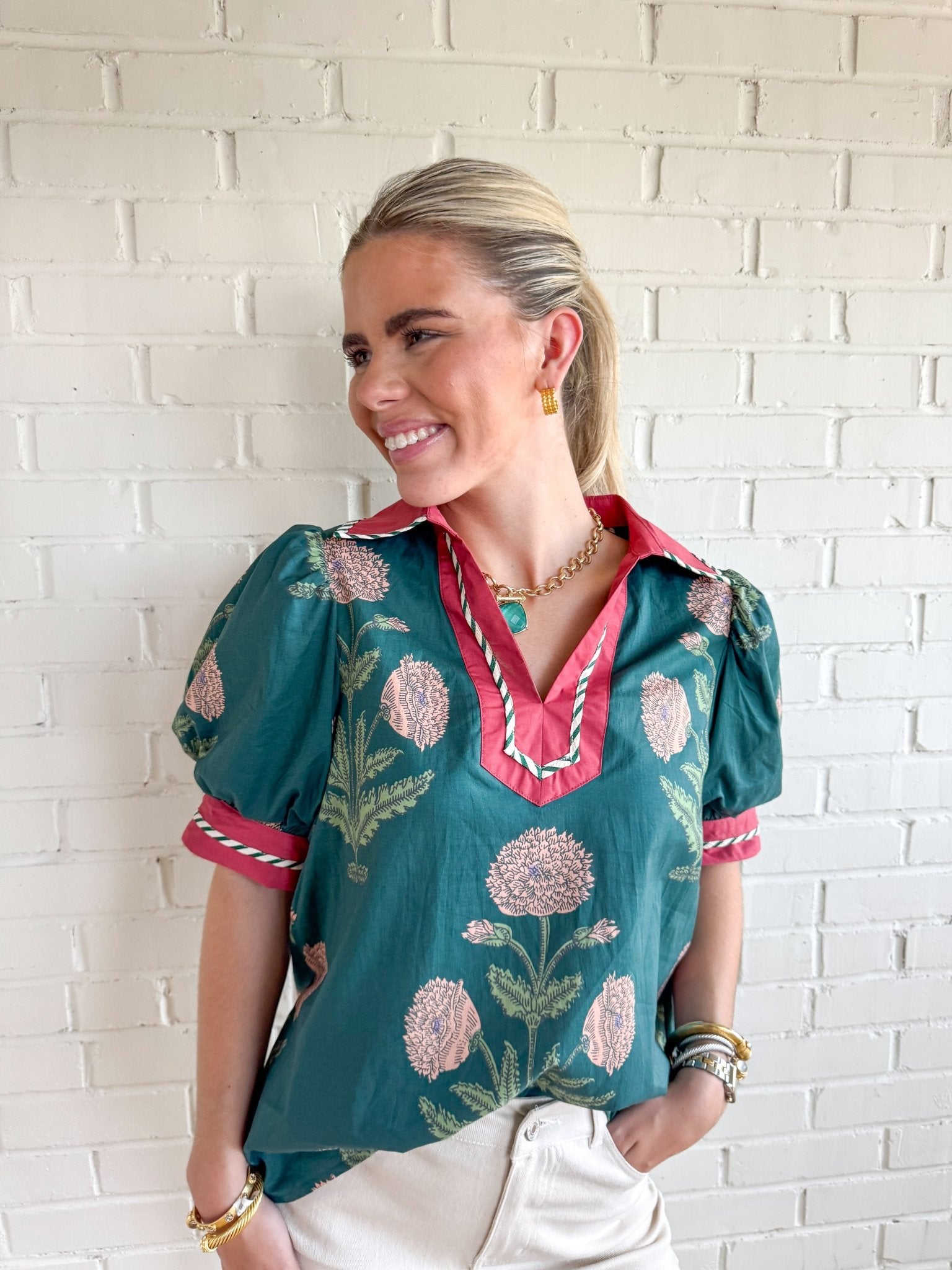 Floral print short bubble sleeve top featuring contrast V-neck collar and band with binding inset detail. Unlined. Woven. Non-sheer. Lightweight.