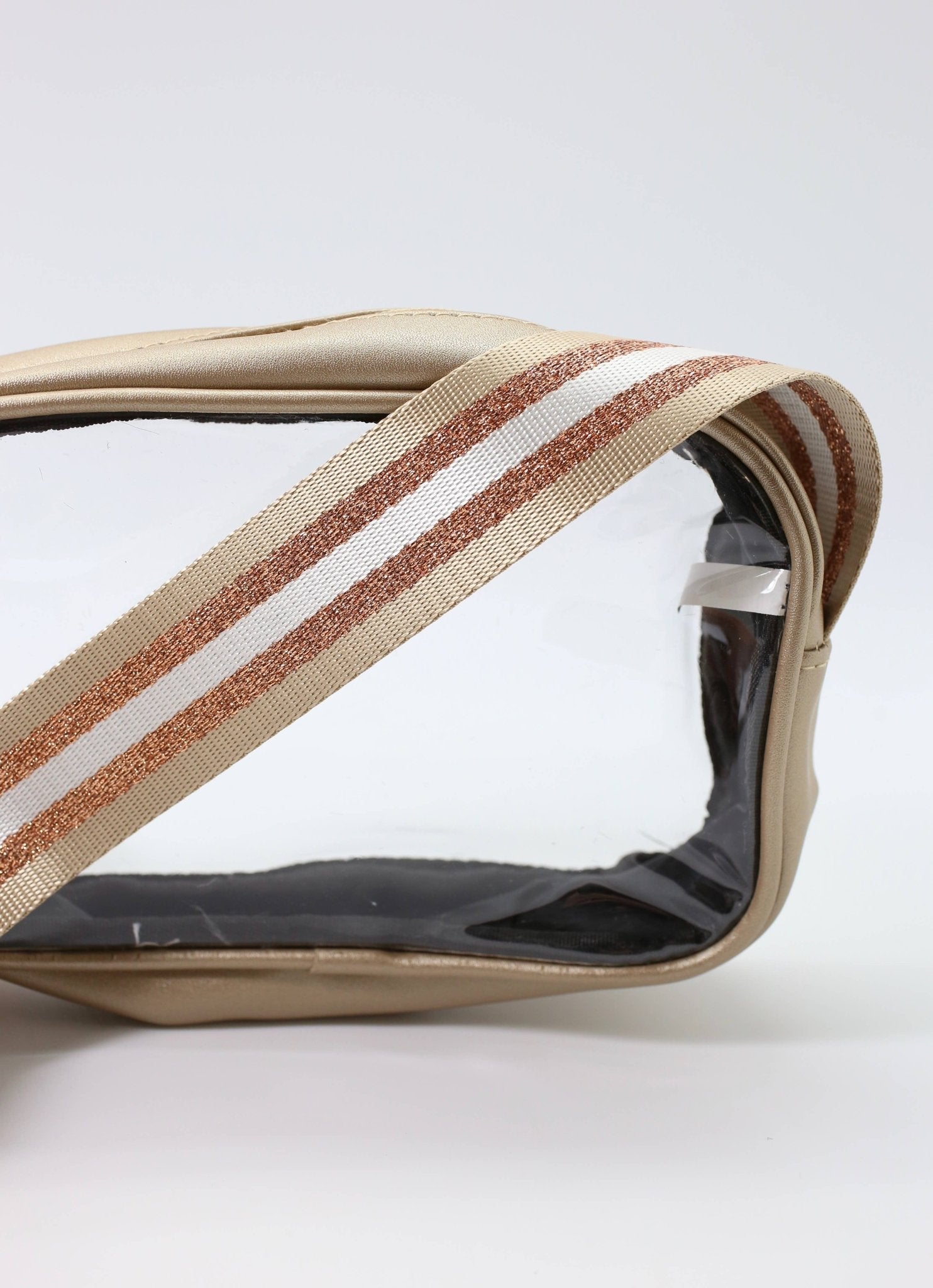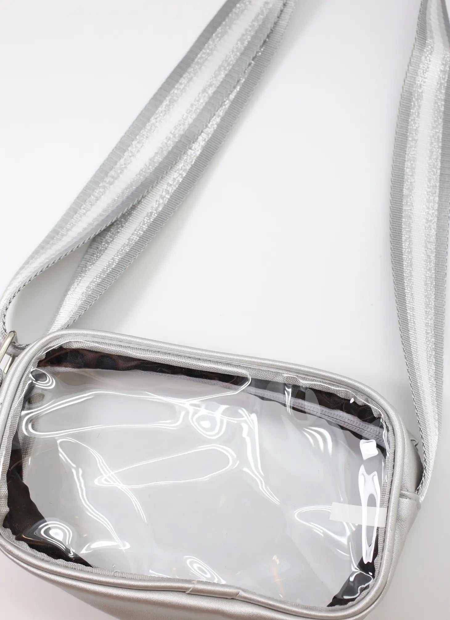 This clear bag has a top zipper closure with a striped crossbody stripe. It has glitter stripe accents and is also adjustable. Great for concerts, events, and Game Day! Dimensions: 5.5" tall by 9" wide