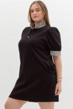 Solid short sleeve pullover polo dress in black featuring contrasting ruffle neck and sleeve band. Pockets at side. Unlined. Knit. Non-sheer. Lightweight.